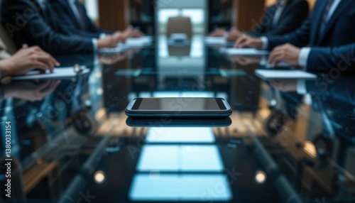 meeting, business, conference, table, tablet, technology, corporate, professional, team, work, collaboration, discussion, office, modern, dark, reflective, glasses, surface, digital, device, elegant, serious, formal, strategy, planning, executive, leadership, management, group, people, hand, document, desk, room, interior, black, blue, grey, sharpened, closeup