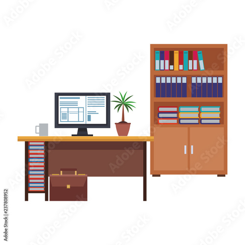 business, office, interior, element, equipment, vector, illustration, desk, computer, briefcase, plant, modern, window, empty, nobody, room, design, space, inside, floor, building, light, corporate, white, furniture, wall, work, indoor, architecture, decor, clean, contemporary, glasses, comfortable, concept, style, workplace