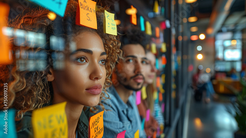 Business or creative presentation Team successful teamwork. Brainstorm meeting with sticky paper notes on glass wall for new ideas, Using agile methodology, Brainstorming in a tech start-up office.