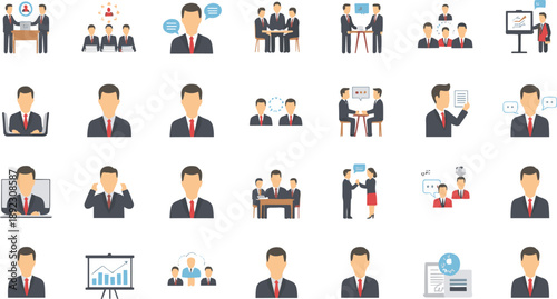 Business People and Corporate Communication Illustration Icon Set Showing Meetings, Presentations, Negotiations, Teamwork, and Professional Office Interaction Concepts