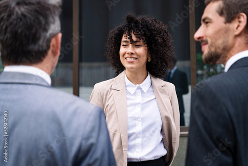 Business people meeting in a business park - Portrait of hispanic beautiful businesswoman with elegant suit talking with office coworkers