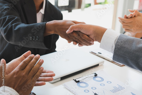 Business people shaking hands after finishing up a meeting. Businessman handshaking after conference. teamwork, partnership, collaboration, corporate concept.