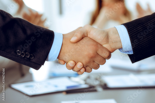 Business people shaking hands at meeting while theirs colleagues clapping and applauding. Group of unknown businessmen and women in modern white office. Success teamwork, partnership and handshake