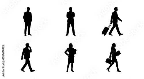 Business people silhouettes walking and standing, Set of male and female business silhouettes standing, walking, carrying luggage, and using phones for corporate commuting concepts.