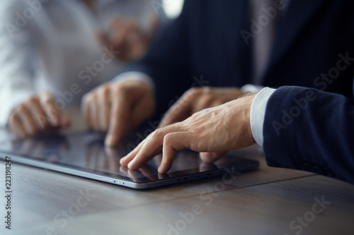 Business people standing at table and touching tablet. Discussing new project. Team business concept.