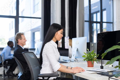 Business People Using Computers Working Concept, Asian Businesswoman Typing Keyboard, Team In Modern Busy Office, Businesspeople Group Creative Open Space Brainstorming Process