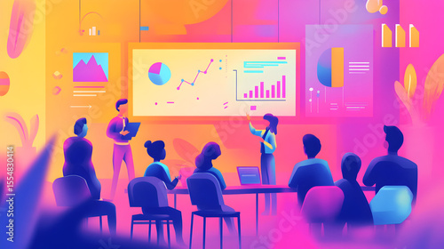 business, presentation, meeting, teamwork, analysis, datum, chart, graph, statistic, whiteboard, brainstorming, training, workshop, seminar, audience, colleague, office, corporate, professional, illustration, vector, design, flat, modern, colourful, people, silhouette, businessperson, businessman, conference, team, sitting, communication, discussion, table, computer, chair, group, woman, work, technology, job, bar