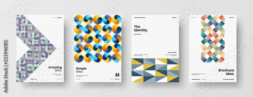 Business presentation vector A4 vertical orientation front page mock up set. Corporate report cover abstract geometric illustration design layout bundle. Company identity brochure template collection.