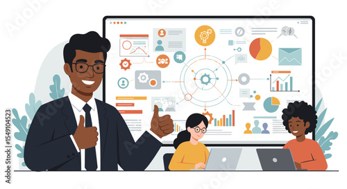 Business presentation with diverse colleagues analyzing data for successful strategy development vector illustration
