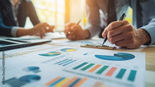 Business professionals collaboratively analyzing financial reports and graphs, engaging in strategic planning and decision making in a modern office environment.