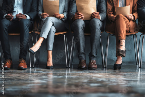 job, interview, business, attire, waiting, office, document, anticipation, formal, wear, shoe, professionalism, seated, modern, chair, leg, positioning, diverse, professional, grey, wall, hardwood, floor, lighting, career, opportunity, process, hiring, employment, preparation, corporate, environment, stylish, relaxed, tension, documentation, setting, area