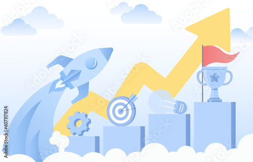 business, start, up, arrow, rocket, launch, take-off, success, successful, achieve, achievement, growth, goal, target, symbol, icon, idea, design, thinking, financial, marketing, planning, management, improvement, development, strategy, statistic, tactical, inspiration, destination, top, motivation, starting, trophy, gear, sky, objective, exploring, space, bar, graph, aim, new, rising, flat, concept, vector, illustration