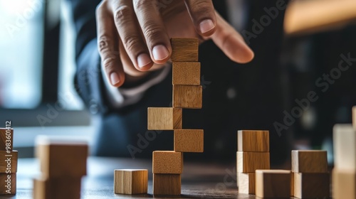 Business Strategy Wooden Blocks Growth Building Success Teamwork Planning Development Vision Leadership Hand Stacking Goal Challenge Ris