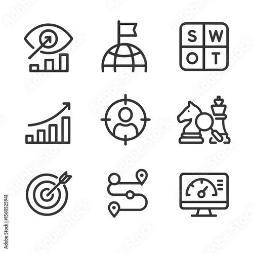 business, strategy, icon, outline, icon, set, concept, vision, statement, mission, swot, analysis, growth, chart, target, audience, competitive, goal, roadmap, dashboard, line, only, black, colours, consistent, stroke