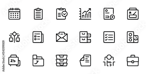 Business symbols represent a diverse set of tasks and categories, including files, data, charts, calendars, email, and other office related work, silhouette