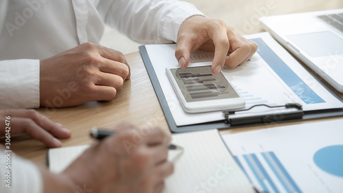 Business team brainstorming and discussing with financial data and report graph. Teamwork meeting working concept.