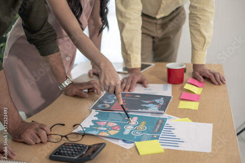 Business team during meeting conference are working documents about the marketing plan and finance sales report of the company with laptop computer