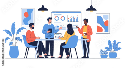 business, meeting, team, teamwork, collaboration, analysis, datum, chart, graph, presentation, discussion, strategy, planning, office, workplace, colleague, diverse, people, professional, communication, laptop, screen, whiteboard, brainstorming, idea, project, success, growth, development, marketing, finance, sale, management, leadership, corporate, modern, illustration, vector, graphic, design, abstract, concept, information, report, progress, performance