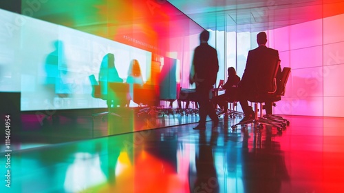 Business team meeting in a modern office, vibrant colors, creative background, silhouettes of people sitting around a table with laptops and documents on it, colorful gradient glass walls,