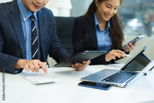 Business team meeting. professional investor working new start up project. Finance task. with smart phone and laptop and digital tablet