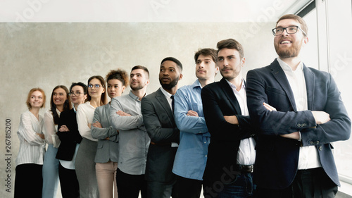 Business team standing in row with boss headed