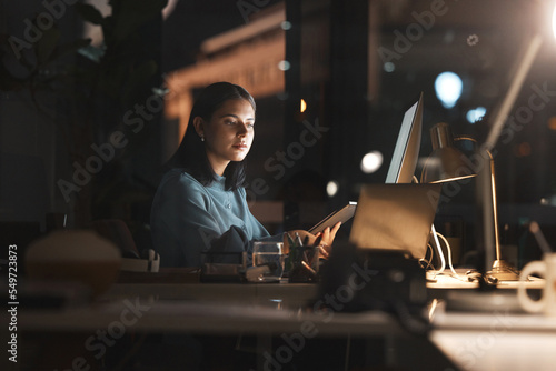 Business woman, in office at night and use tablet with computer planning, thinking and working on digital strategy for financial company. New york, corporate employee and fintech banking security