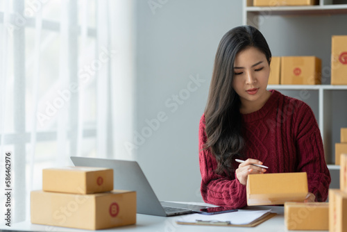 Business woman owner holding parcel box Verify the correctness in the list, address, customer phone number for parcel delivery through the express delivery company. startup business ideas.