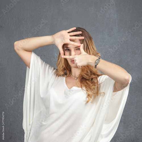 camera, posing, framing, photo, isolated, hand, attractive, white, collar, arm, business, brown, shot, adult, studio, only, occupation, people, 1, caucasian, black, men at work, female, fashion, confidence, suit, young, woman, skirt, person, gesture, businesswoman, professional, hair, real, looking, beautiful, background, manager, image, office
