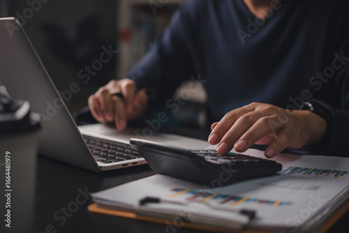 Businessman calculating financial report with calculator and laptop, analyzing business data and charts at office desk, accounting and investment planning concept.