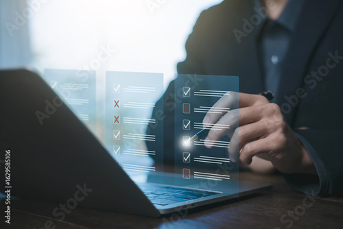 Businessman checking virtual task checklist on laptop using stylus. Digital approval interface with checkmark symbols, representing task validation, rejection, and verification process.
