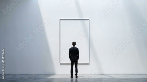 businessman, frame, wall, introspection, contemplation, white, scale, solitude, art, empty, office, space, professional, thoughtful, minimalism, sharpened, design, interior, modern, abstract, environment, viewing, standing, expression, silhouette, background, contemporary, serenity, individuality, scene