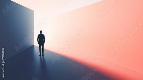 businessman, contemplating, future, corridor, abstract, minimalist, concept, crossroad, decision, uncertainty, leadership, corporate, business, presentation, opportunity, choice, path, direction, success, ambition, hope, perspective, contrast, colours, geometric, shape, light, shadow, design, background