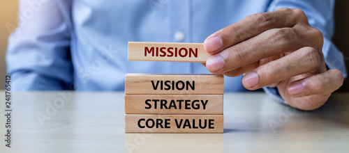Businessman hand holding wooden building blocks with Businessman hand holding wooden building blocks with MISSION, VISION, CORE VALUE, STRATEGY concepts