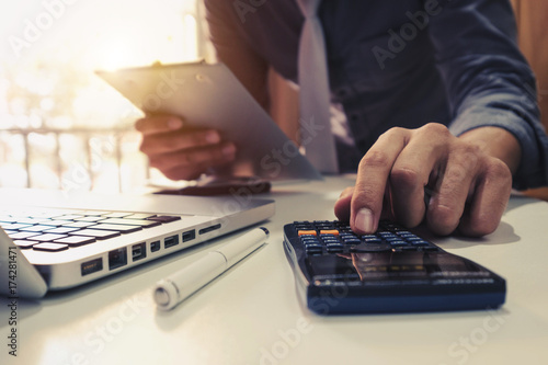 businessman hand working with finances about cost and calculator and laptop with tablet on withe desk at office in morning light