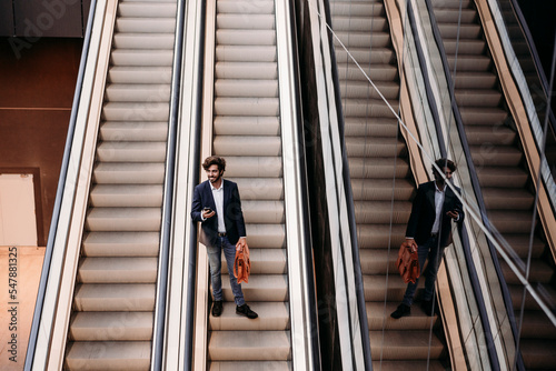 businessman, holding, bag, moving, down, escalator, smiling, smartphone, technology, 1, people, communication, adult, business, man, outdoors, day, spain, occupation, job, standing, mobile, phone, wireless, connection, convenience, accessibility, young, caucasian, looking, step, briefcase, male