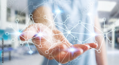 Businessman holding digital data network in his hand 3D rendering