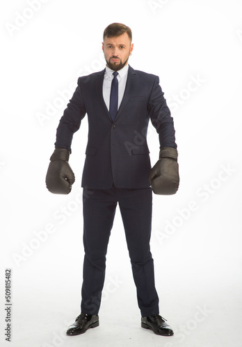 businessman in a business suit and boxing gloves posing on a white background isolated in full growth with a variety of emotions