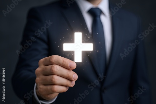 Businessman in formal suit holding glowing medical cross symbol for healthcare concept.