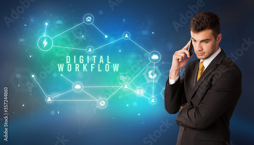 Businessman in front of cloud service icons with DIGITAL WORKFLOW inscription, modern technology concept