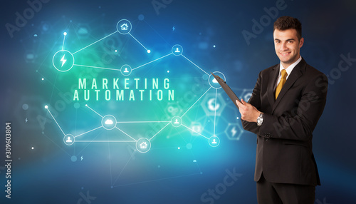Businessman in front of cloud service icons with MARKETING AUTOMATION inscription, modern technology concept