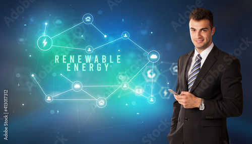 Businessman in front of cloud service icons with RENEWABLE ENERGY inscription, modern technology concept