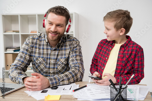 leisure, table, activity, young, adult, ethnicity, caucasian, children, family, male, man, boy, childhood, children, beard, occupation, lifestyle, businessman, music, together, togetherness, bookcase, indoor, schoolboy, earphones, profession, son, relation, eltern, father, daylight, paper, daytime, chequered, entrepreneur, relationship, preteen, self employed, freelance, freelancer, home office