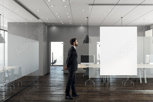 Businessman in modern office with banner