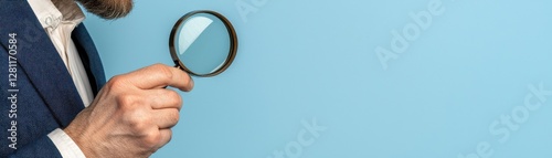 businessman, magnifying glass, investigation, exam, suit, casual attire, office, analysis, detective, search, sharpened, observation, clarity, detail, researching, research, task, concept, inspection, closeup, professional, examine, intent, tool, workspace, business, vision, light blue, engagement, modern, male, zoom, perspective, briefcase, corporate, sophistication