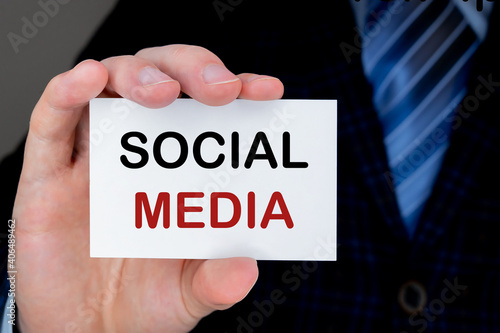 Businessman in suit showing or holding business card with SOCIAL MEDIA text.