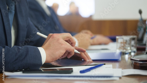 business, tablet, stylus, meeting, conference, office, negotiation, corporate, technology, digital, modern, work, suit, lawyer, politic, workplace, discussion, cyberspace, datum, screen, touch, device, seminar, training, teamwork, closeup, anonymous, strategy, professional, communication, report, business plan, agenda, work tool, innovation, paper, writing, note, management, office work