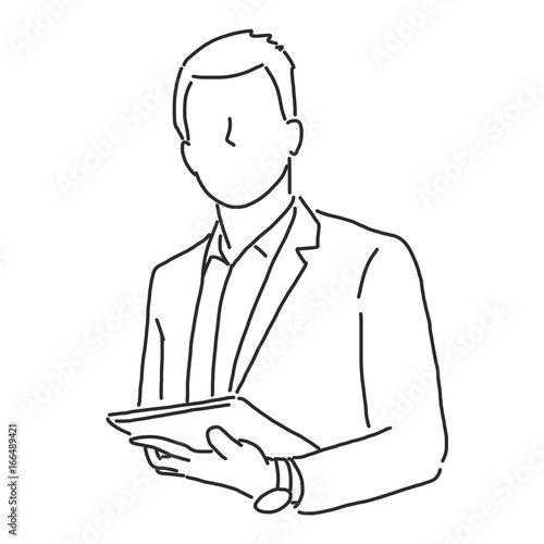 Businessman is standing with a tablet and thinking about his work, line drawing vector illustration graphic design