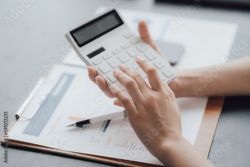 businessman or accountant hand working on calculator to calculate business data, accounting document and laptop computer at office, business concept