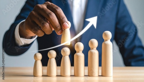 Businessman placing peg person on wooden block stairs with rising arrow representing career growth and professional advancement