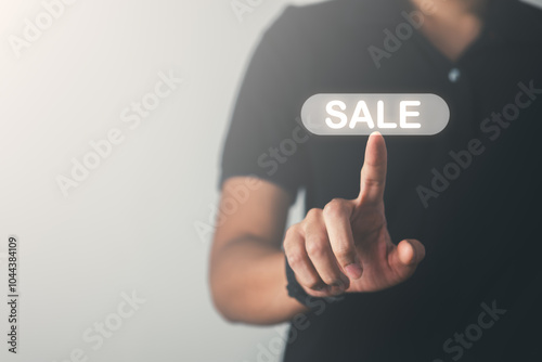 Businessman pointing Sell text. Business, marketing and shopping online concept.